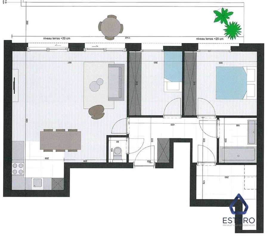 Verder beschikt het appartement over een aparte bergruimte met aansluiting voor wasmachine, 2 slaapkamers, een badkamer met dubbel badkamermeubel en bad met douchescherm.
